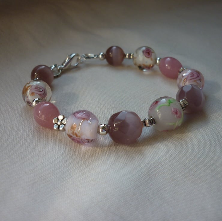THE BRACELET HAS BEEN MADE USING 12MM HANDMADE GLASS LAMPWORK BEADS IN PINK, WHITE AND SILVER ALONG WITH A SELECTION OF PINK CONTRASTING BEADS, SILVER DAISY SPACER BEADS, ROUND SPACER BEADS AND FINISHED WITH SILVER PLATED LOBSTER CLASP.