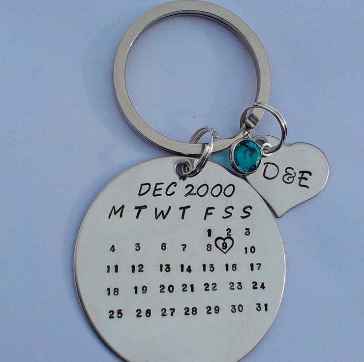 It is made from a 1.5" stainless steel disc, which is hand stamped with a calendar of the month and year of your choice. The important date is then circled with a heart, and it is finished with a hand stamped heart tag which can either have a name or a set of initials stamped, and a swarovski crystal birthstone for the month (although this can be another colour if you would prefer)