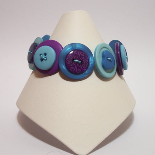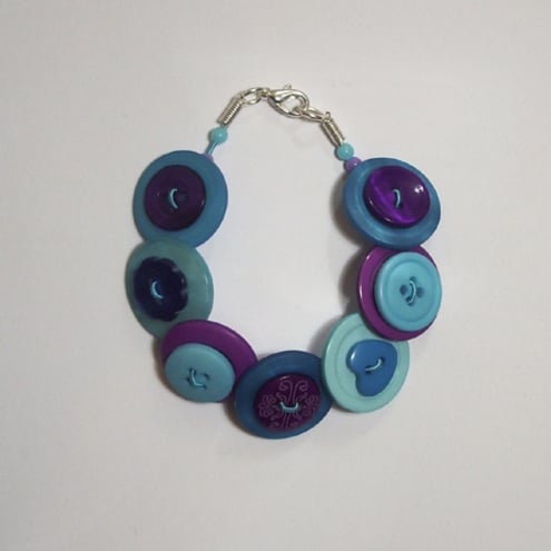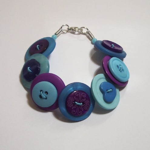 This distinctive button bracelet is rich with an assortment of purple, teal and aqua buttons. These are threaded onto jewellery wire, which secures at the end with a silver plated lobster clasp fastener.