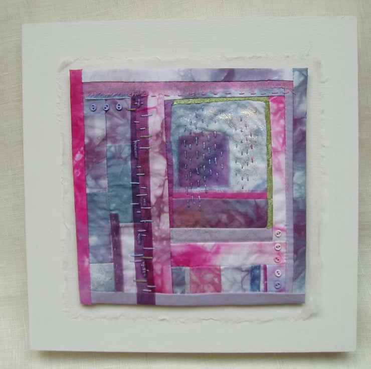 The textile work measures 13 x 13 cms (5.5 x 5.5 ins) and is mounted onto a fine piece of handmade paper and then onto the solid white board which measures 20 x 20 cms (8 x 8 ins).