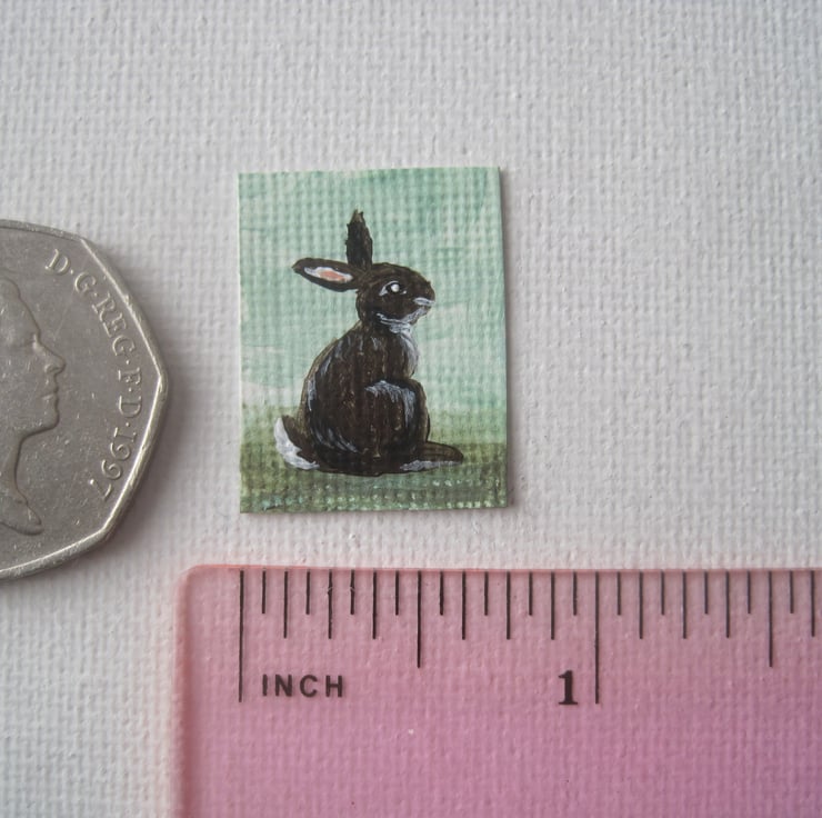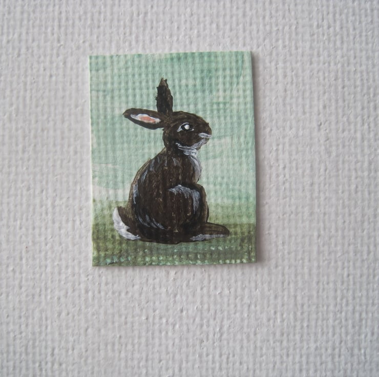 This is a tiny wee painting of a bunny rabbit, suitable for dolls house enthusiasts.