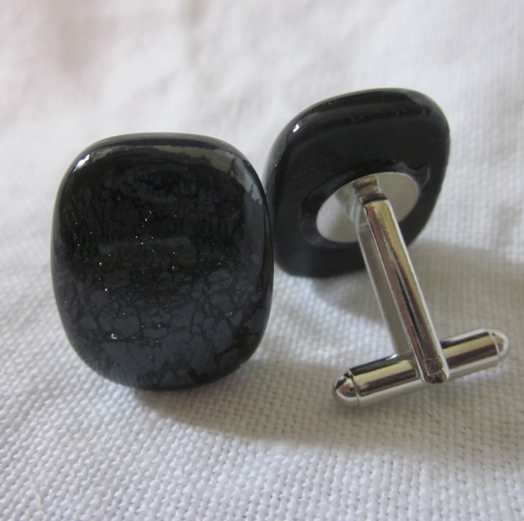 These rectangular cufflinks have a black base with a pretty dichroic shimmer in dark charcoal grey, almost black. They are fitted with silver metal cufflink backs. They are approximately 1 inch by 3/4 inch and look sophisticated and smart.