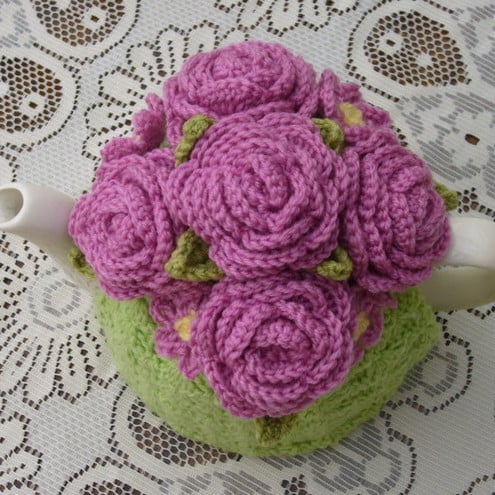 The cosy has been handmade using good quality yarn in a very pretty light green colour. The top of the cosy is decorated with five individual roses in pink with sage green leaves. Around the edges of the roses are four little flowers in pink with yellow crochet bobble centres.