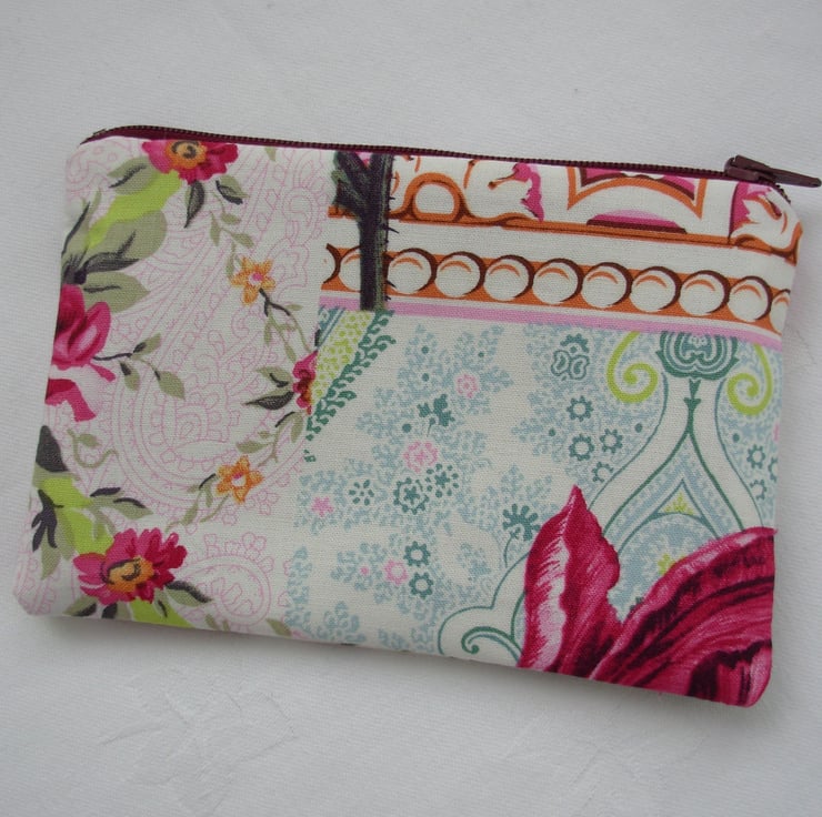 I've made this little make up bag / coin purse from the 'French Journal' range of cotton fabric which has flowers and leaves in greens, pinks and aqua. It is fully lined in a dark pink cotton fabric, has a top zip and has interfacing to give stability.