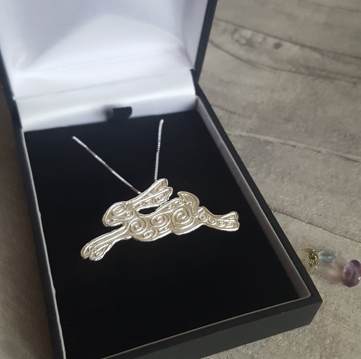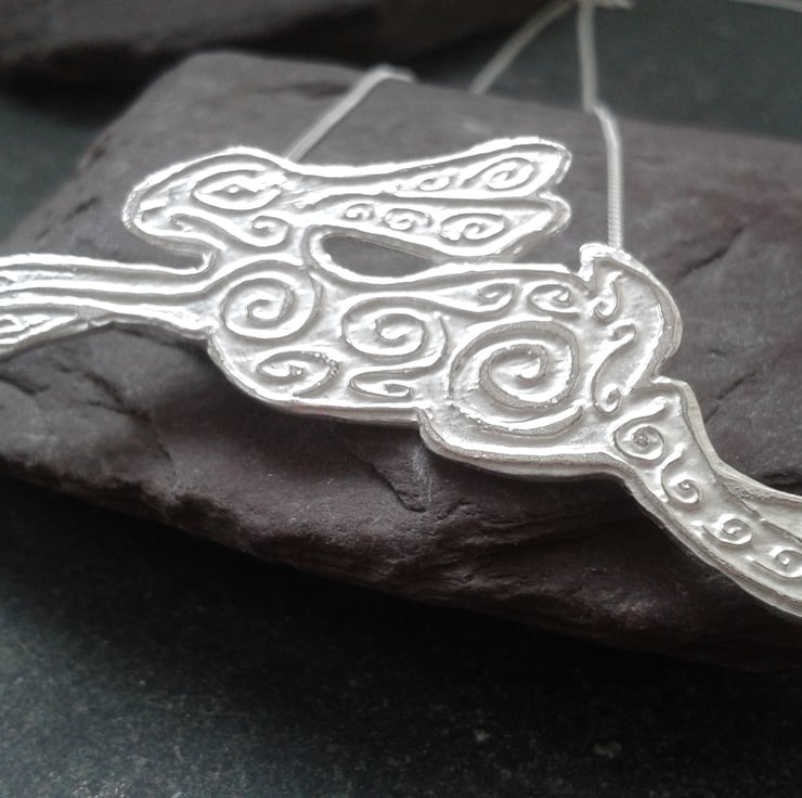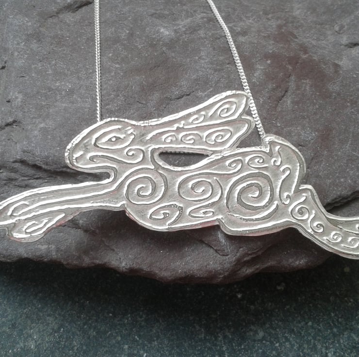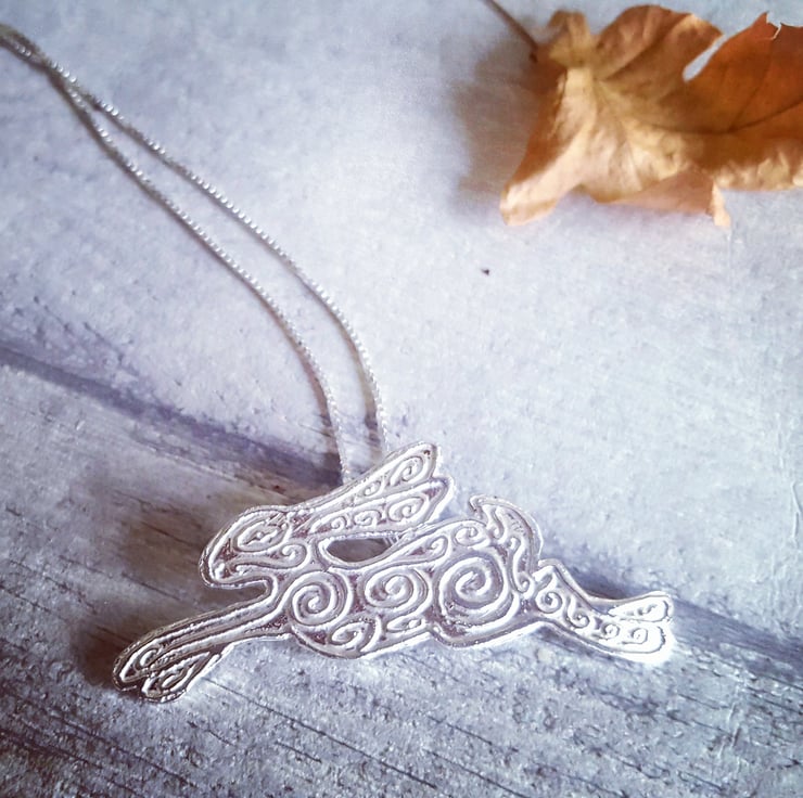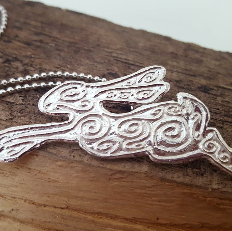 Andromeda is another of my leaping hare designs transformed into a silver pendant. She was etched into silver sheet using one of my original leaping hare designs using a process of acid etching.