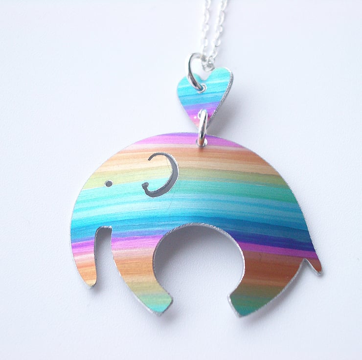 This sweet little elephant pendant is hand made from aluminium which I have dyed in pretty rainbow stripes and sealed so that the colours become a permanent part of the metal. I cut out the shapes by hand using a piercing saw and file the edges so that it catches the light. The elephant is slightly domed and hangs from a small rainbow striped aluminium heart. The jump rings and chain (16") are all sterling silver. If you would like a different length chain, please ask.