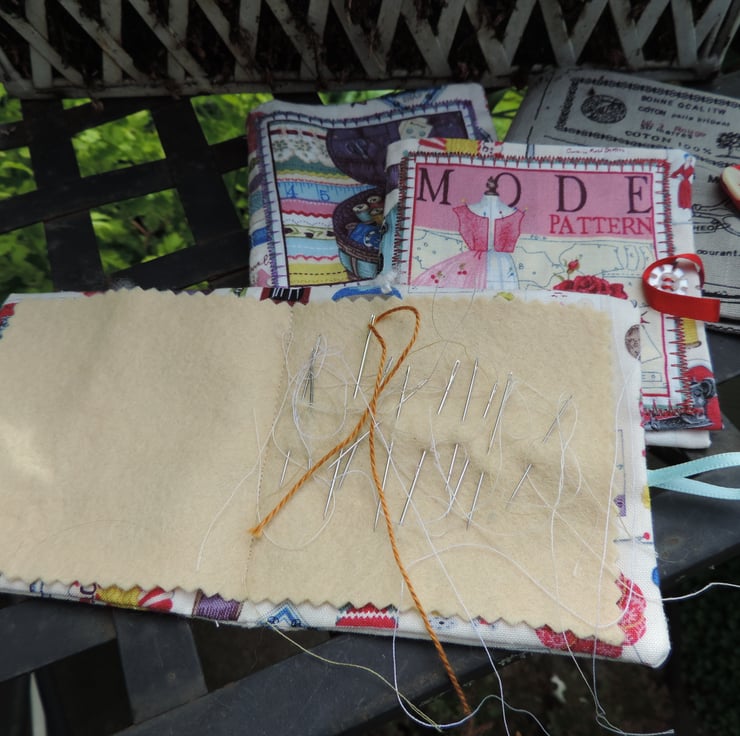 Hand sewn vintage style needle case in a grey ,vintage sewing print The group photo shows the interior of my own, much loved needle case to show the interior.