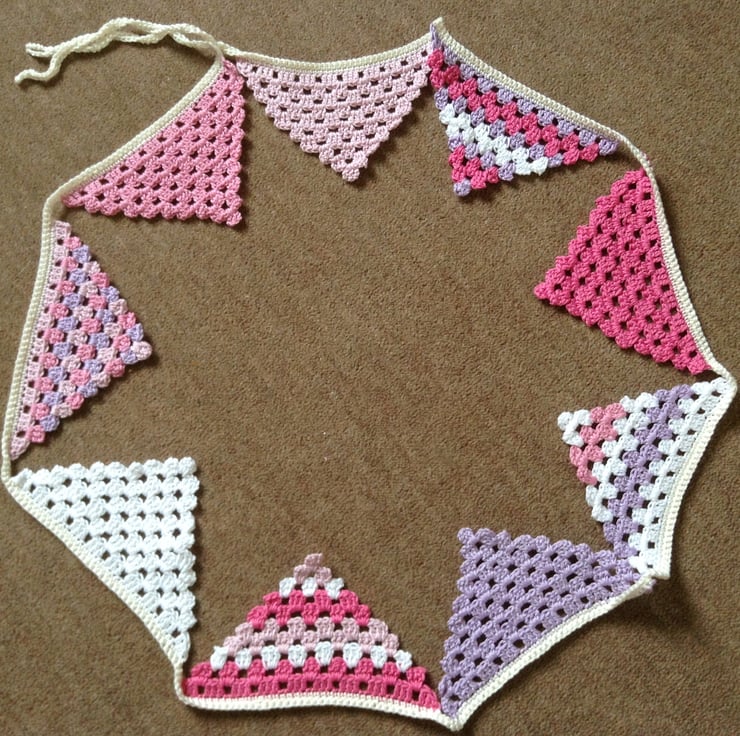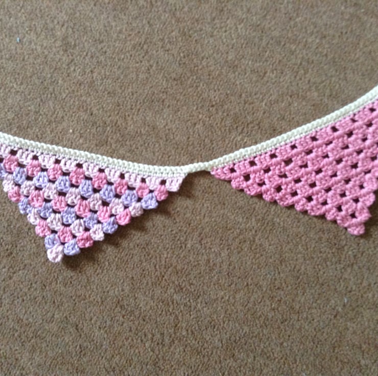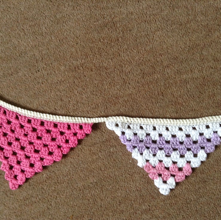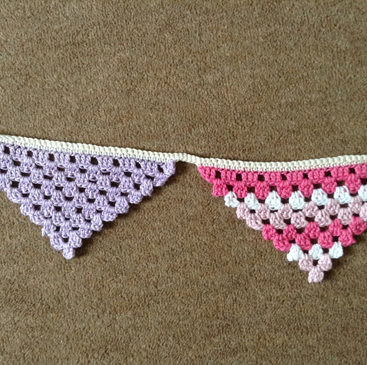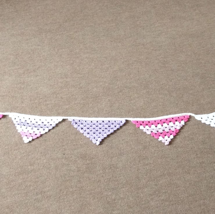 This pretty crocheted triangular bunting in shades of pink,lilac and white is a lovely decoration for a nursery or little girl's room.