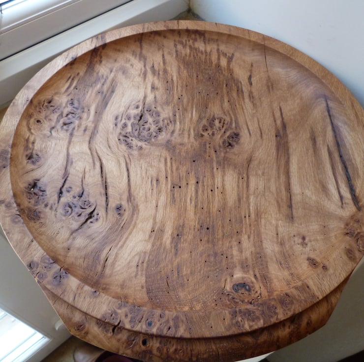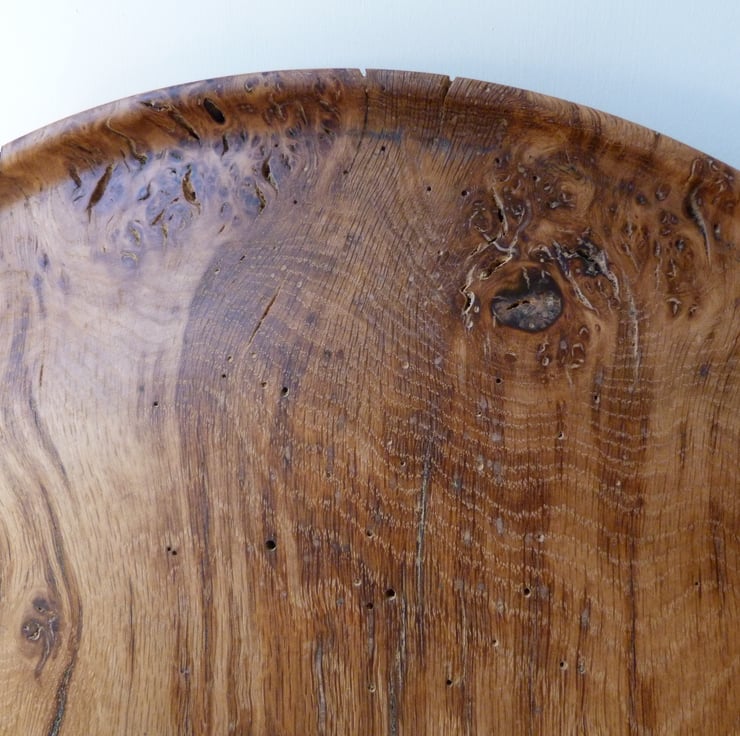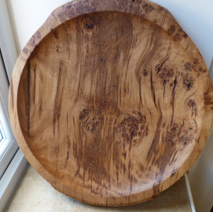 17'' WIDE TO THE OUTSIDE OF THE INTEGRAL HANDLES. I COULD HAVE DONE MORE TO THIS OLD PIECE OF BROWN OAK BURR, DECORATION AT THE RIM, A PROFIL STEP INSIDE PERHAPS. AT THE OUTSET I DID'NT WANT TO DETRACT FROM THE WOODS NATURAL BEAUTY, SO HERE IT IS. THERE ARE SIGNS OF VERY ANCIENT INSECT INFESTATION, THE WOOD HAS BEEN TREATED SEVERAL TIMES AND KEPT FOR A LONG WHILE-ALL OK FINISHED WITH ORGANIC OIL, READY FOR USE.