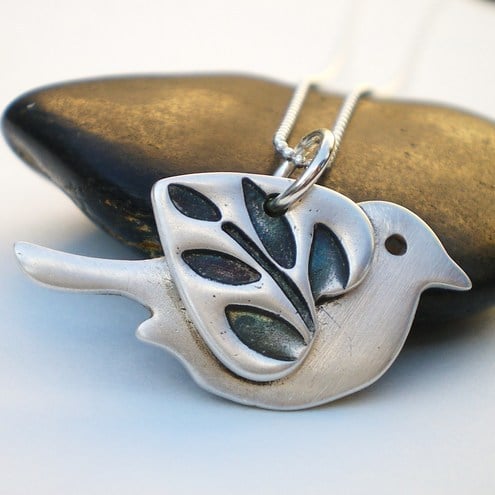 Bigger than my other tiny birds, he measures 3.5cm (1 1/2 inches) from beak to tail and 2cm across his tummy. His heart wing is textured with a really delicate leaf pattern. The pattern has been oxidised to create a dark patina, which I've protected with jeweller's lacquer.