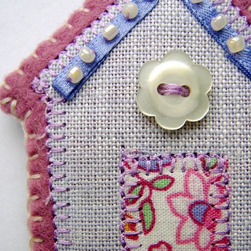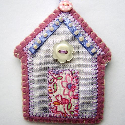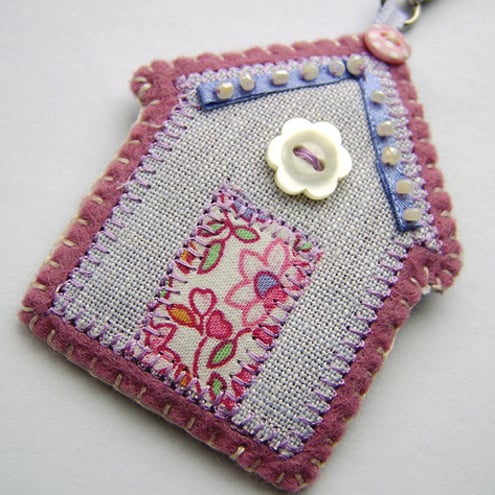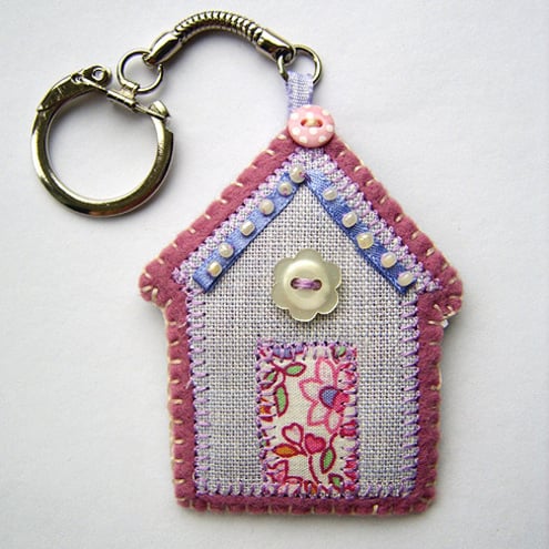 The beach hut is in linen fabric with a pretty cotton print door and beaded roof, it is finished with a couple of pretty buttons! It is mounted onto a felt base and has a metal key ring attached.
