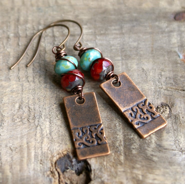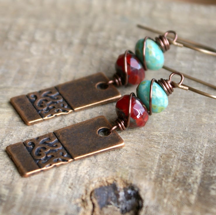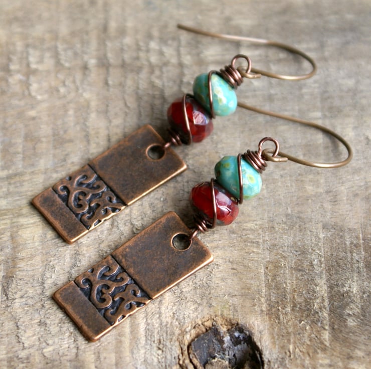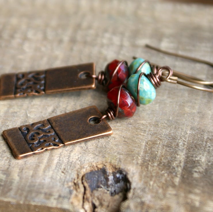 These earrings have been made using beautiful antiqued copper patterned oblong drops and Czech glass faceted rondelles in vibrant shades of red and turquoise.