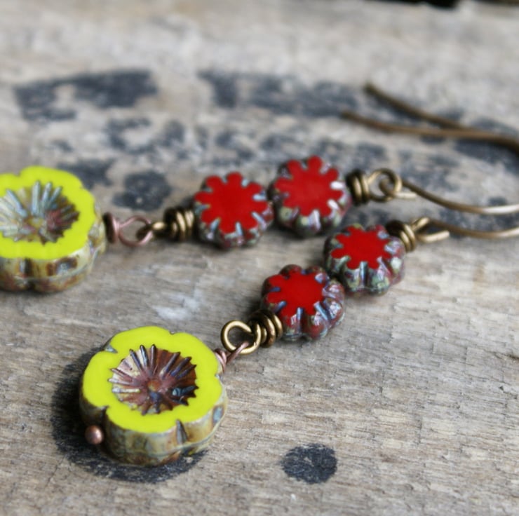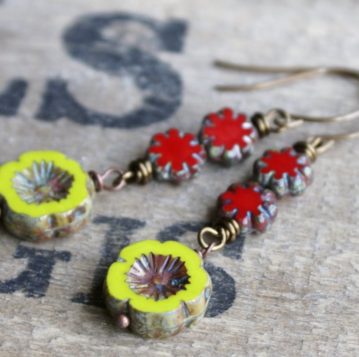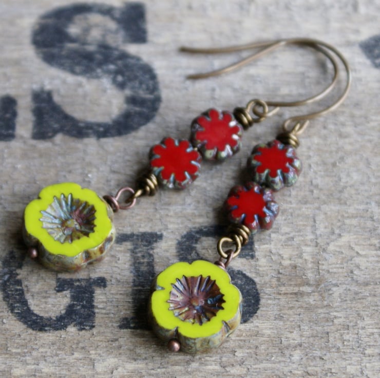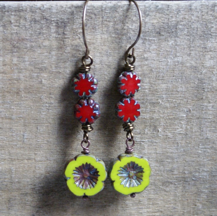 Sitting on copper ball headpins below are gorgeous Czech glass pansy flowers in a vibrant shade of chartreuse / lime, again with rustic finish at the edges and in their carved centre.