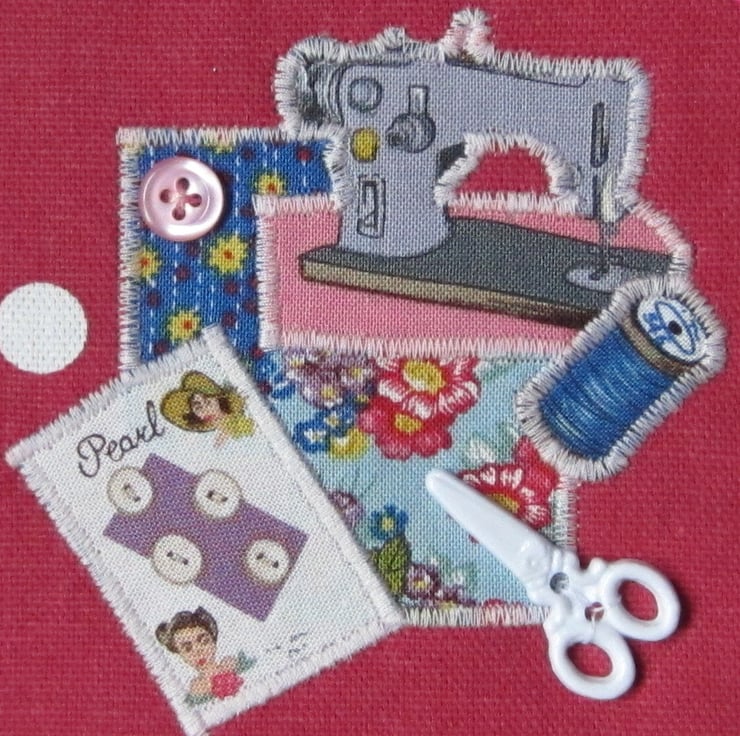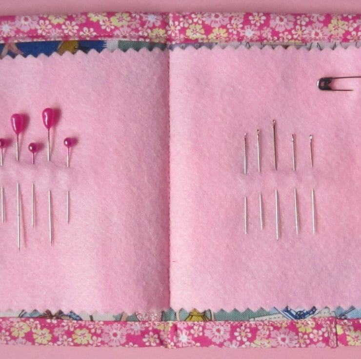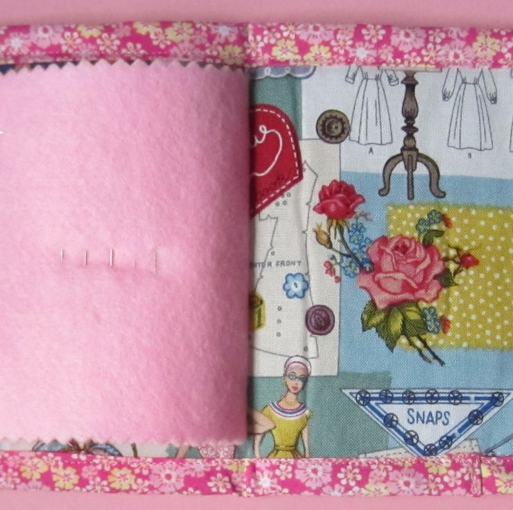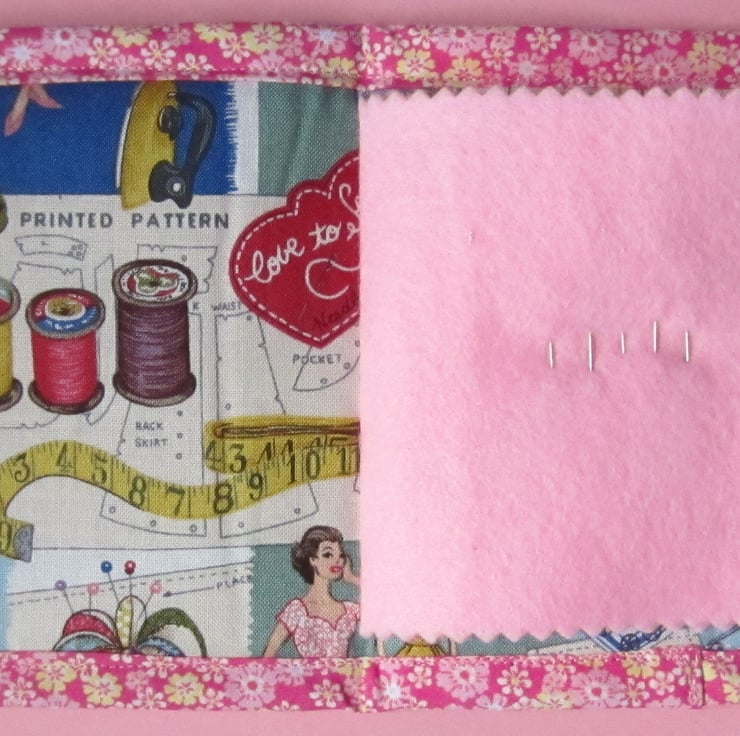 Lightly padded needle case appliqued with a sewing machine, reel of cotton and other sewing items and decorated with a pink button and a pair of scissors button. Inside there is a pink felt page complete with needles, pins and a threader. Edged with pink and lemon floral bias binding and backed with matching vintage sewing items fabric. Measures 12.5 x 13.5 cm when closed (25 x 13.5 cm open).