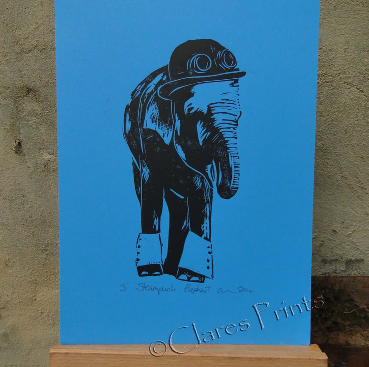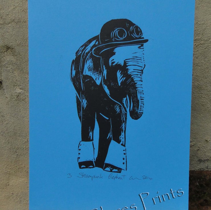 Keywords: Steampunk Elephant Art Linocut Lino Print Printmaking animal retro black and white top hat goggles cogs