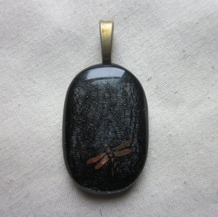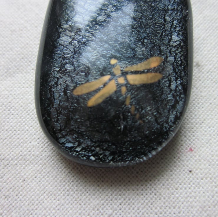 This glass cabochon was fused by me. It has a beautiful dark grey dichroic shimmer on a black glass base. It is approximately 1 1/4 inch high. It is far more beautiful than in the photograph, quite sophisticated - it is impossible to do justice to this glass. On the surface is a 22 carat gold dragonfly. Please note that this is not a sticker but a real gold glass decal. This pendant has a bronze coloured metal bail. This will come with a free cord necklace.