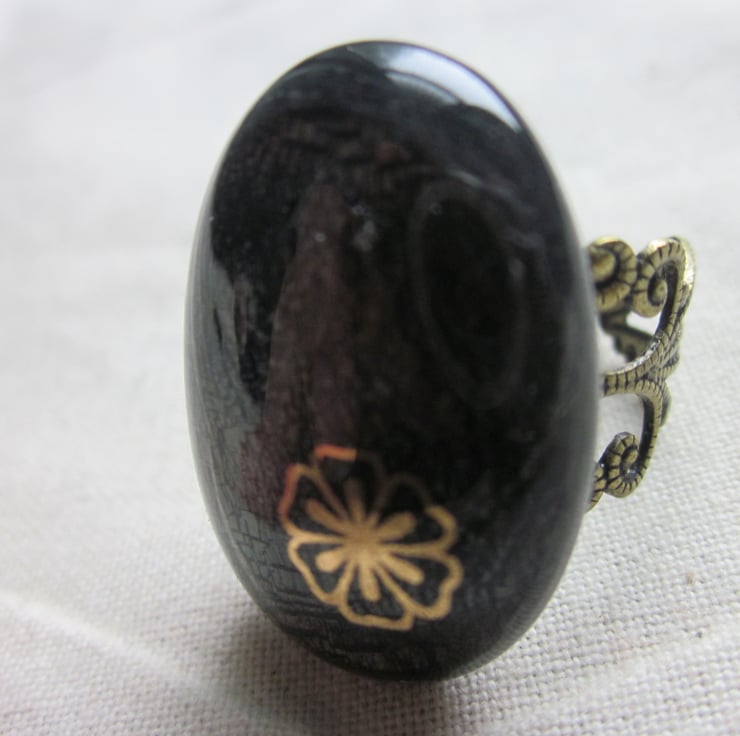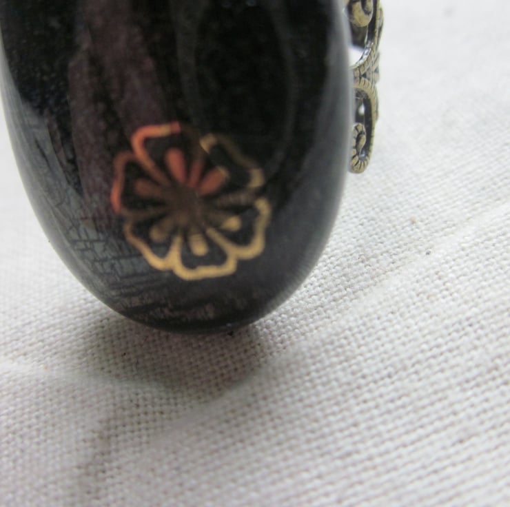 This glass cabochon was fused by me. It has a beautiful dark grey dichroic shimmer on a black glass base. It is approximately 1 inch high. It is far more beautiful than in the photograph, quite sophisticated - it is impossible to do justice to this glass. On the surface is a 22 carat gold clematis. Please note that this is not a sticker but a real gold glass decal. This ring has a bronze coloured metal filigree adjustable ring.