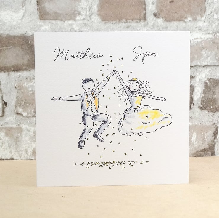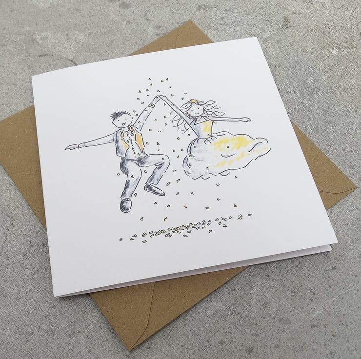 This Wedding card Wedding Jump Blonde has been printed with my original artwork on white texture FSC approved 280gsm card and comes with a brown kraft envelope protected in a clear biodegradable bag.