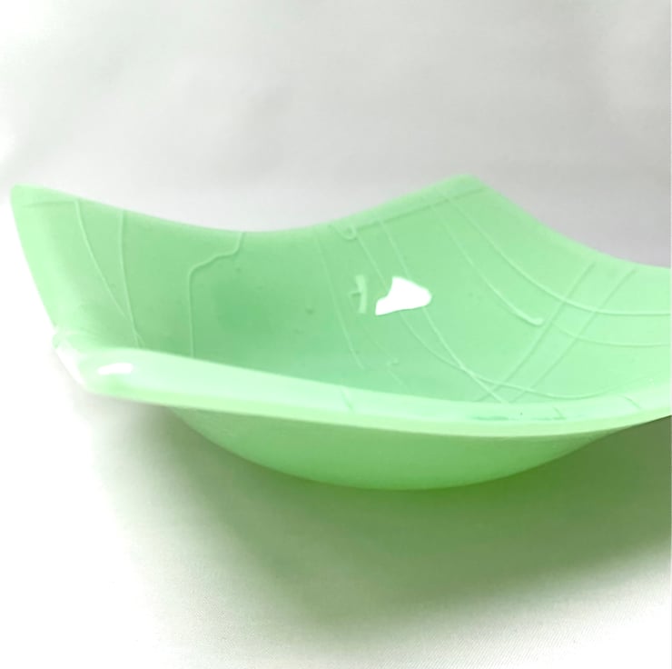 This beautiful mint green glass was topped with a clear streaked sheet of hand-cut glass before being fused at 800 degrees Celsius into one solid piece. It was then returned to the kiln to drape over a mould to form this fresh looking, one of a kind glass bowl. It measures approximately 18.5cm across and is 6cm deep.