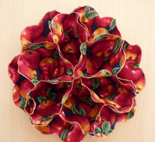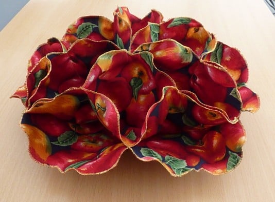 This lovely bright colourful handmade Bread Roll Collapsible basket is not just great for keeping your Bread Rolls nice and hot but it can be used also for your favourite sweets and Chocolates. It's made from a Apple printed cotton Fabric in Greens, Reds, & Orange . There are 6 inner pockets and 6 outer ones. It's made up of 3 sections which have been Zig Zag stitched all the way around the outsides and then all sewn together to form this lovely Basket. I've added 2 presstoods to hold it together in the middle.