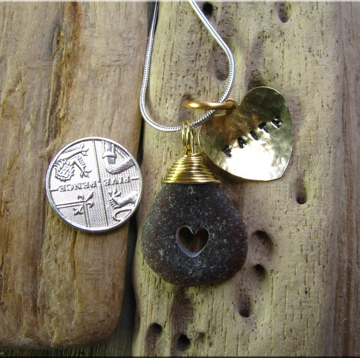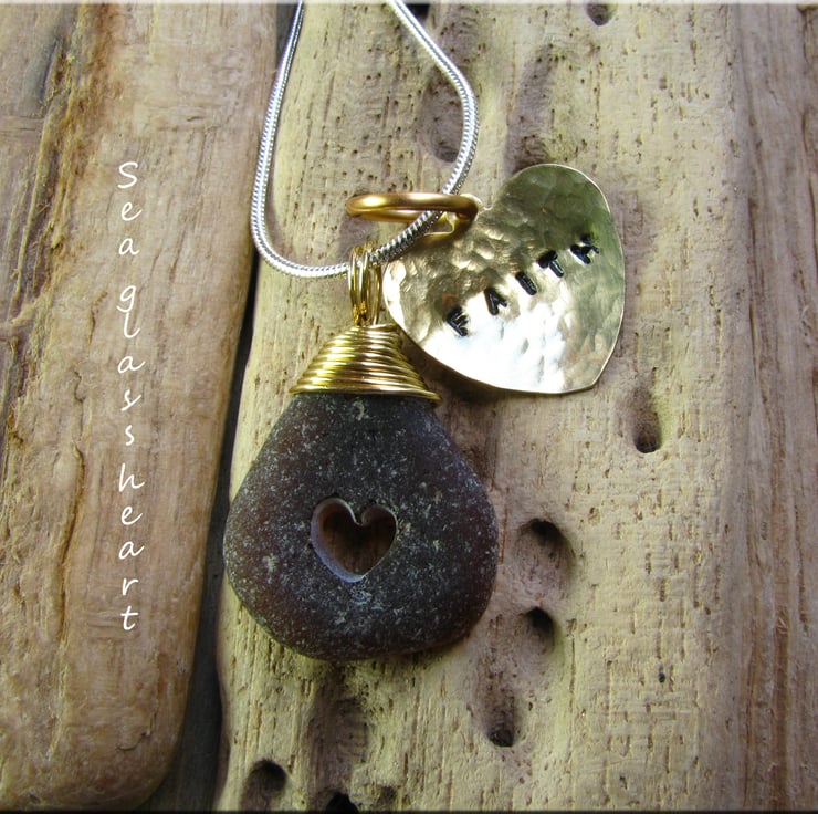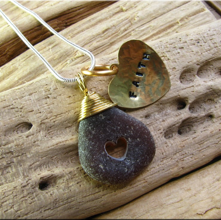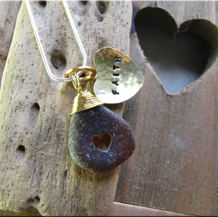 A gorgeous root beer coloured piece of sea glass with a wire wrapped bail, and textured brass word charm which says FAITH. It has a lovely carved heart within. The wire is bare brass, and the pendant is suspended from a silvertone snake chain. Approx. 18"
