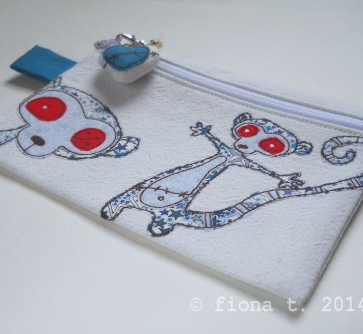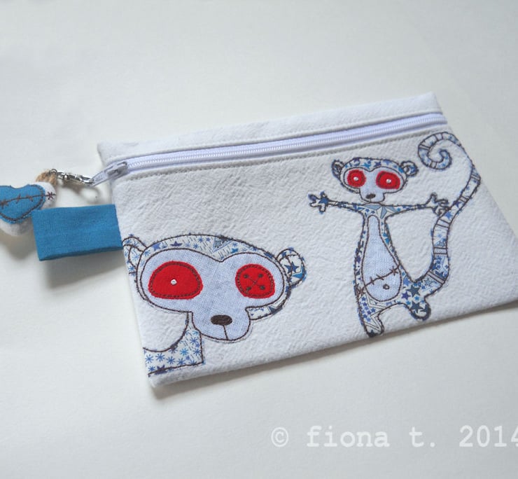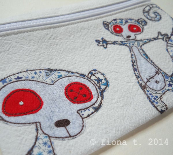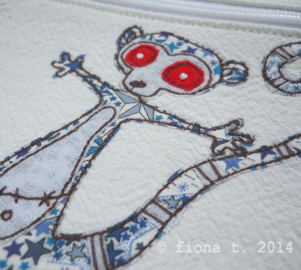 the lemur is in a liberty print fabric, with pale blue linen detail to his face & tummy which contrasts with his bloodshot eyes. his eyeballs are hand embroidered.