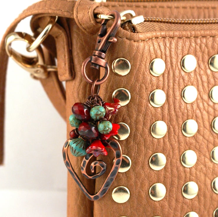 This bag charm / key ring features a gorgeous antique copper plated hammered swirl shaped heart.