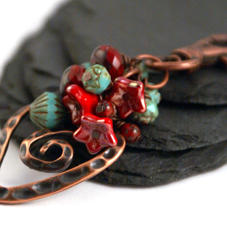 Wire wrapped above are a cluster of mixed premium Czech glass beads in vibrant shades of red and turquoise. These include five petal flowers, faceted rondelles and pretty rosebud beads.