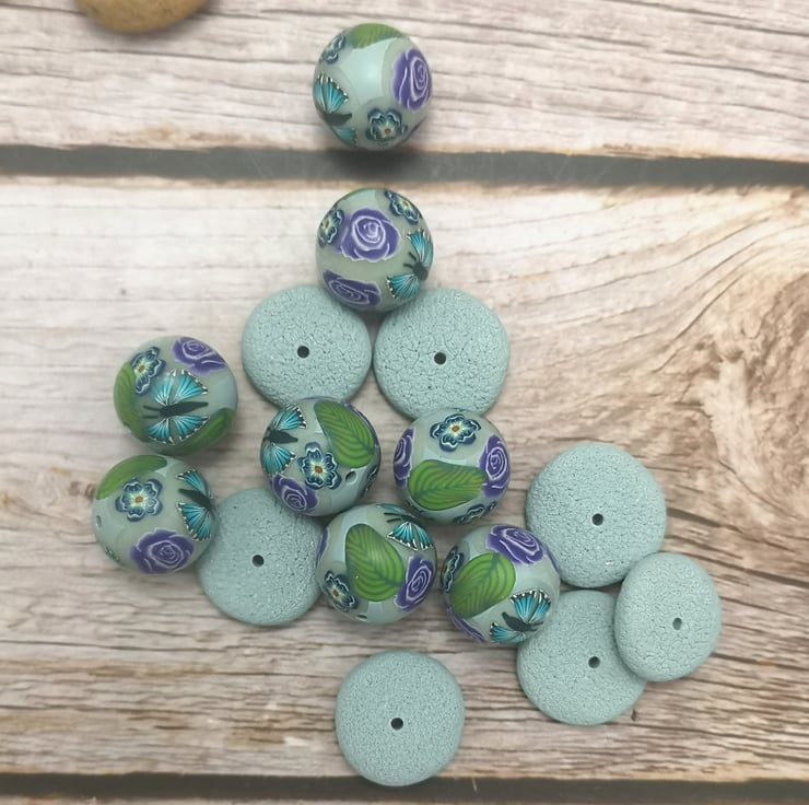 8 blue coloured polymer clay beads decorated with flower, leaf and butterfly millefiori. These beads come with 7 matching blue coloured disk spacer beads.