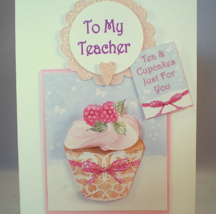 A small white card measuring approximately 90x115mm (3.5x4.5in) has a 3D effect cupcake mounted on pink card. This is for a teacher and the outer greeting is printed on a diecut glittercard shape with a little heart.Insert is heart shaped with words
