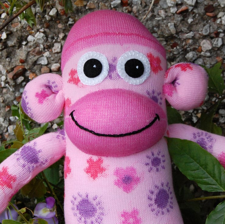 Wendy is a lovely pink flowery monkey handcrafted from from a pair of brand new socks and filled with polyester fibrefill conforming to EN71, CE marked and safe for babies, children and adults too!