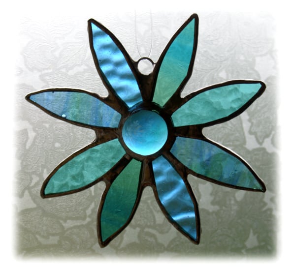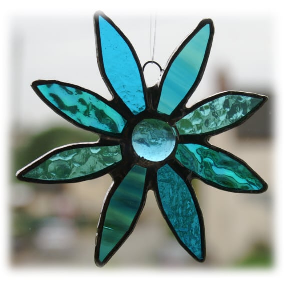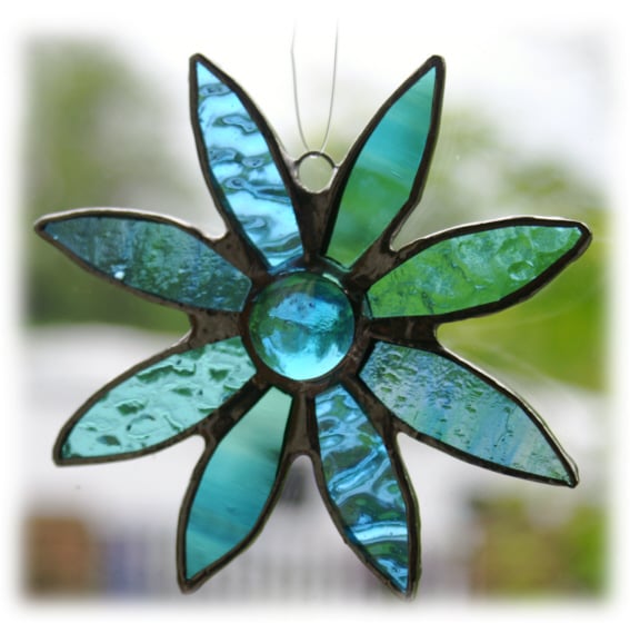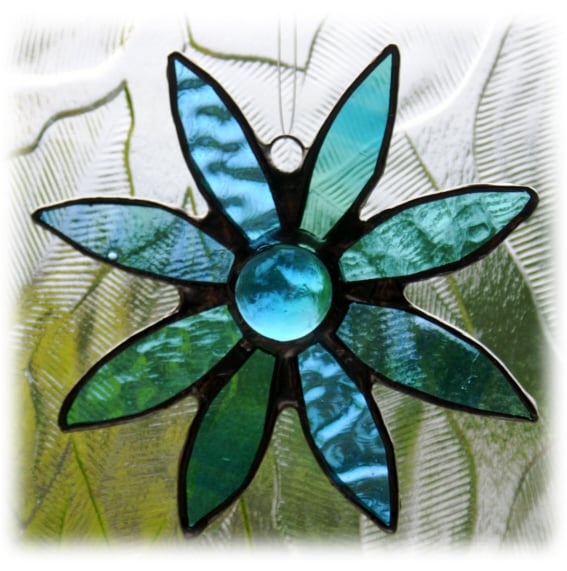 It is a very pretty bright turquoise flower, a daisy, made with 4 types of lovely turquoise and teal shades of glass. Some textured, some iridescent. The centre of the flower is made from a bright turquoise glass nugget.