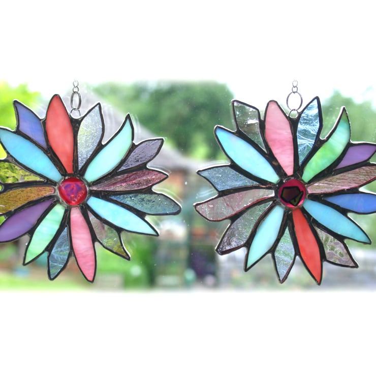 I've used the same 16 types of glass in each flower but reversed the order in which they are placed so the flowers match each other but are very different.