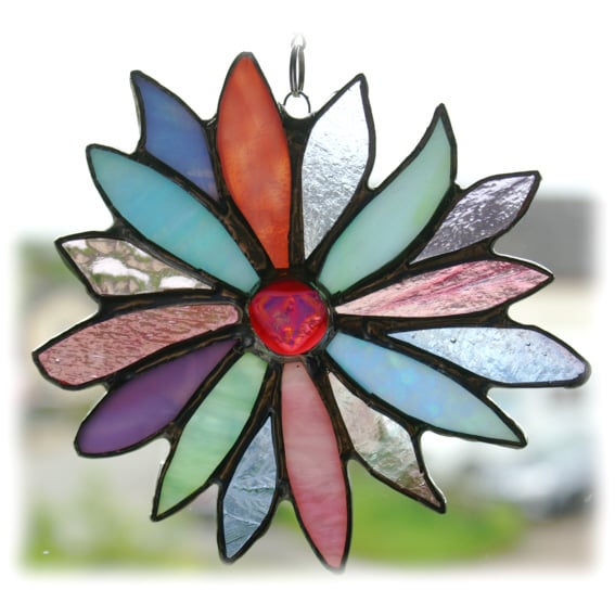 This is a stained glass suncatcher made using the Tiffany copper foil technique.
