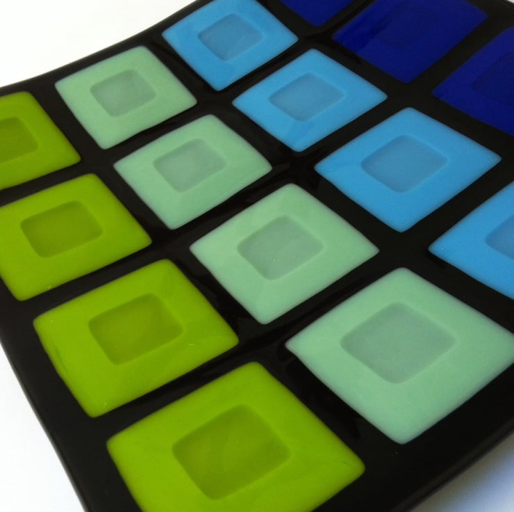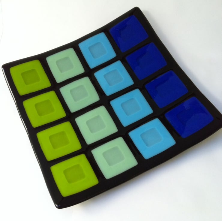 Stunning black 24cm sq platter decorated in 4 layers of blue and green blistered blocks of hand cut glass. Fused for 12 hrs in my kiln, the platter was fired again to slump into shape before annealing and cooling. By annealing, any stress in the glass is reduced making it more durable.