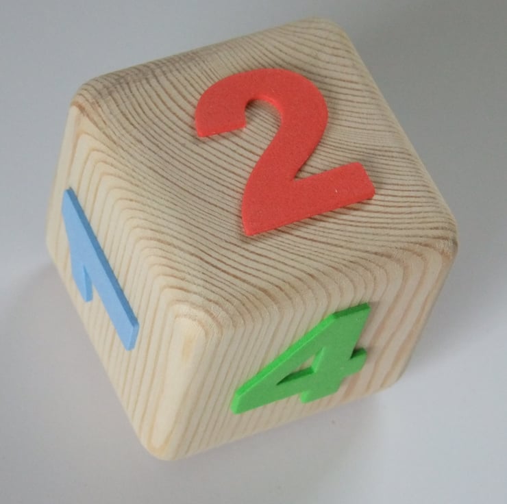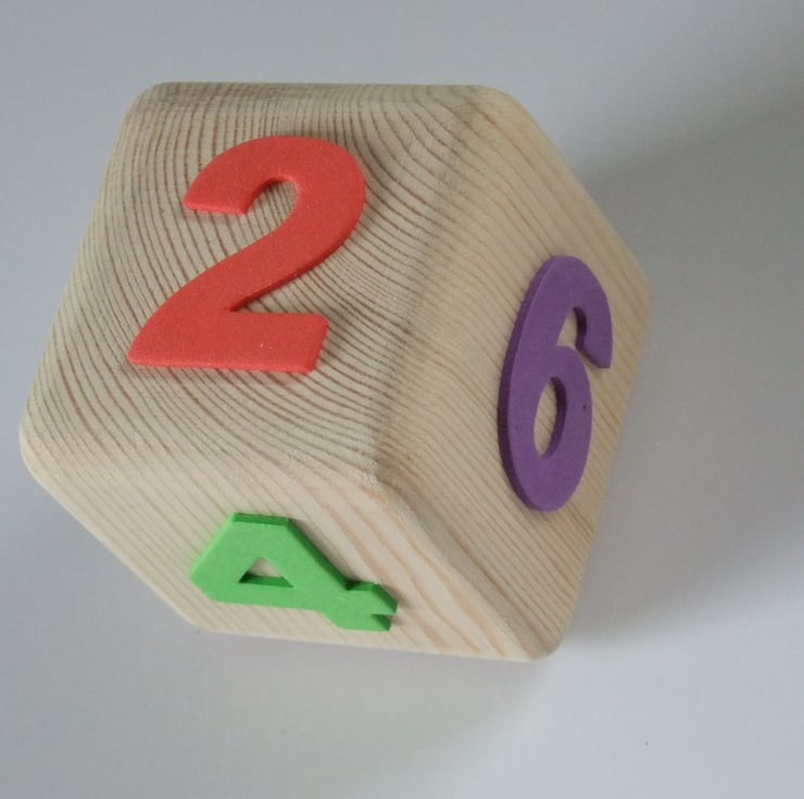 I make wooden dice, ideal for a young child to play with or for an adult to teach the child to count. Have fun learning to count by playing games. Suitable for pre-school or playschool children or for those who have difficulty holding a smaller dice.