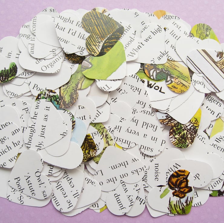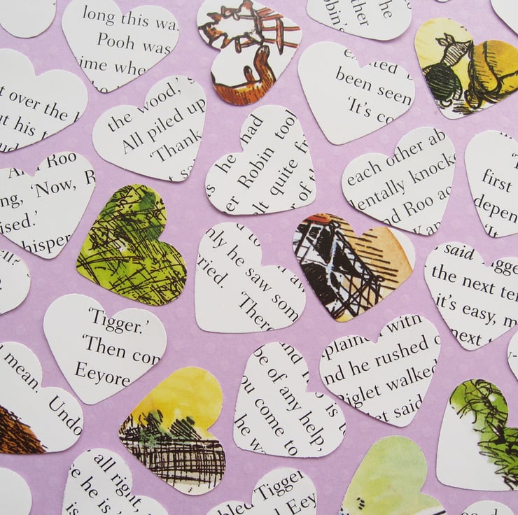 Delicate hearts hand punched from the books of Winnie The Pooh books can add an extra touch to a special occasion or project. They can be used in many ways: