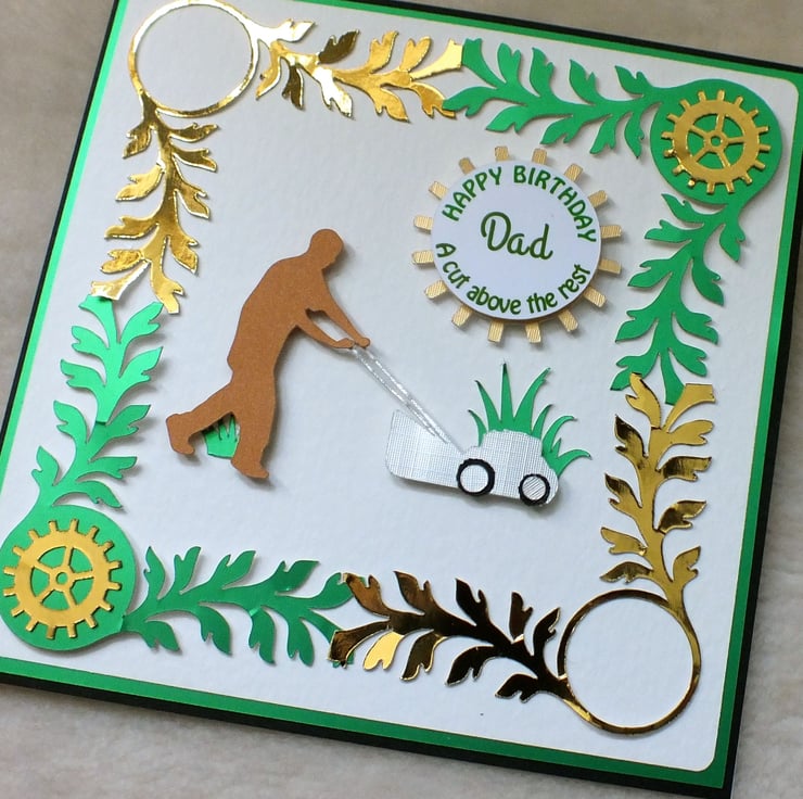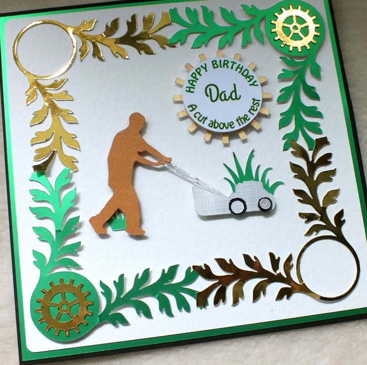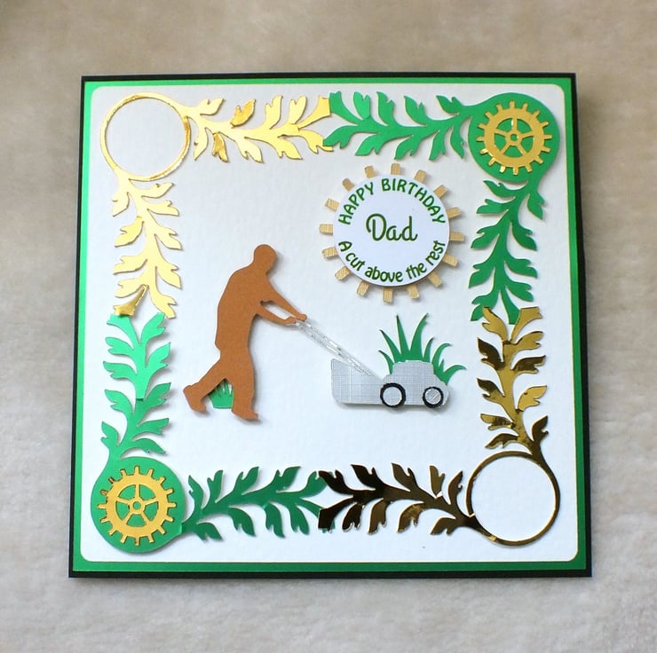 This is such a cool card for a hard working Dad who loves his lawn, or maybe he looks after yours, or perhaps is a groundsman. It measures 7”x7”, matted and layered with premium quality card stock, plus green satin and gold mirri hand crafted die cuts. Includes the sentiment ‘Happy Birthday’ inside.