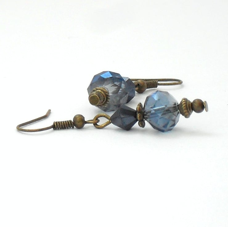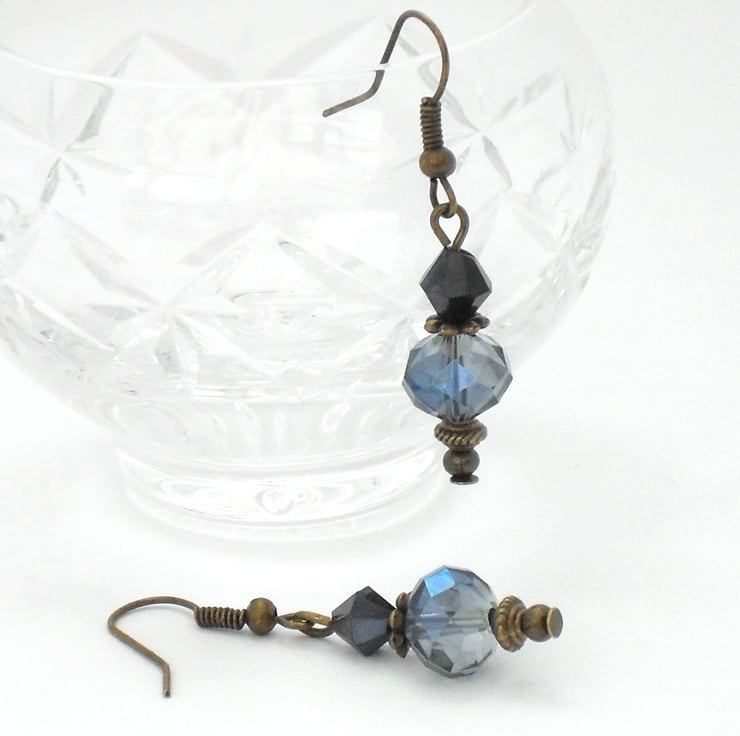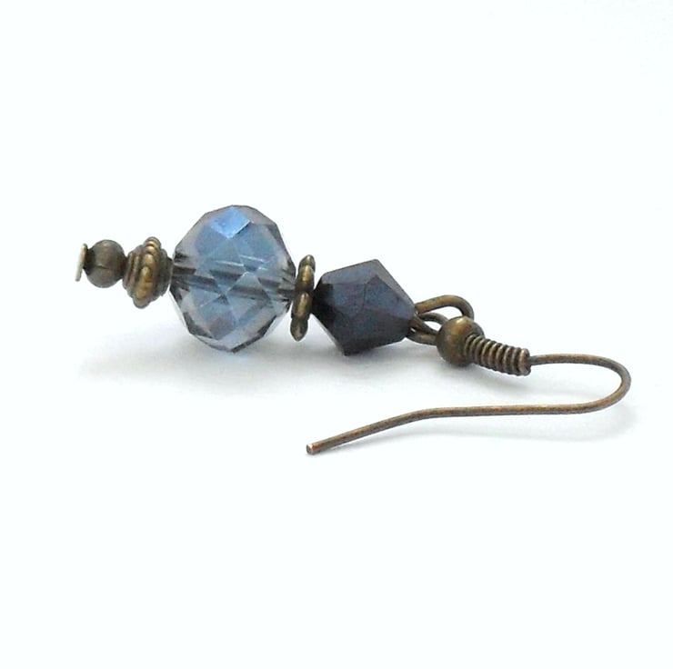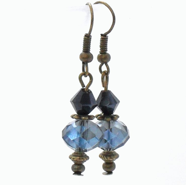A stunning pair of earrings created with contrasting blue crystals hung with bronze beads and wires.