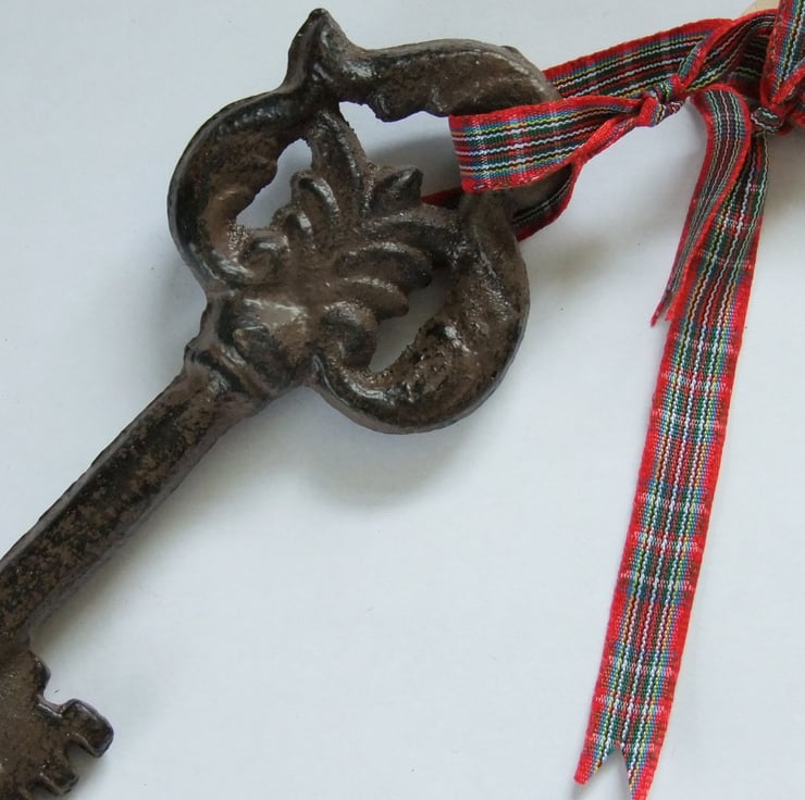 I have attached the key to the fob using a tartan coloured ribbon, but I can use blue or pink, for boy or girl if you would prefer.