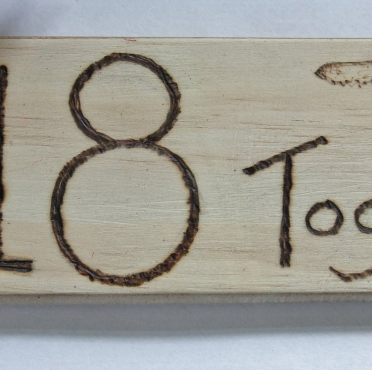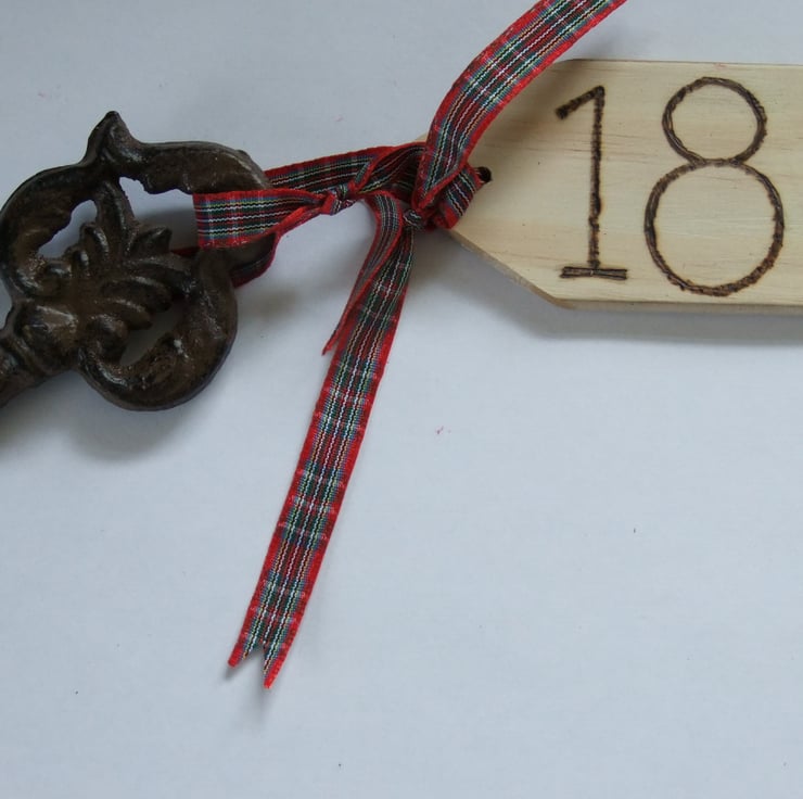 Each one has a heavy solid metal key attached to a wooden gift tag with the wording either 18 Today or 21 Today. The writing has been burnt on using a pyrography tool by hand, hence the crude, simple font.
