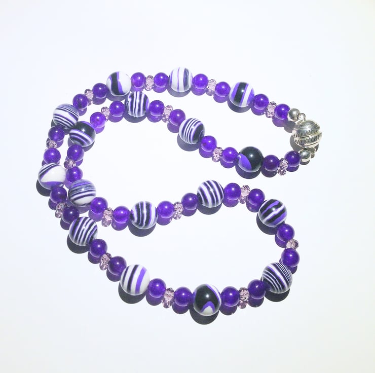 This stunning necklace is hand made from purple stiped agate (9.5-10 mm) and amethyst beads interspersed with small crystal beads.