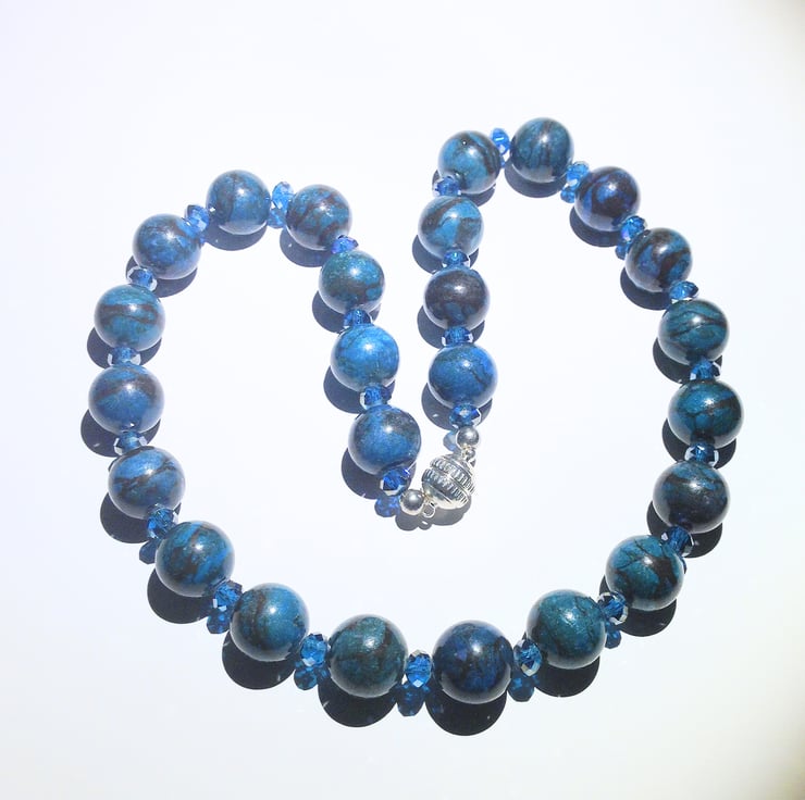This stunning necklace is hand made from chunky round turquoise blue 14 mm turquoise gemstone and attractive crystal beads.