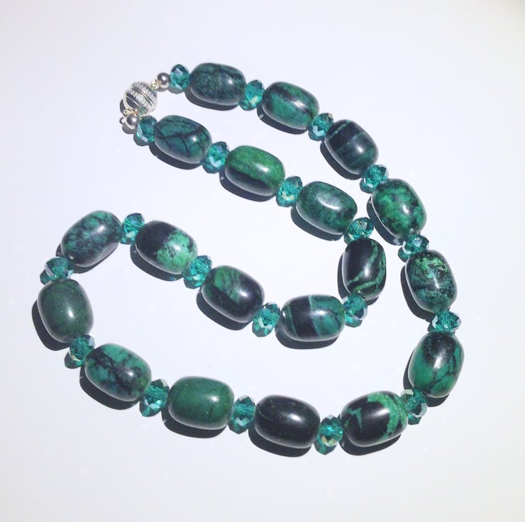 This stunning necklace is hand made from chunky (approximately 18 x 13-14 mm) green turquoise beads and attractive crystal beads.
