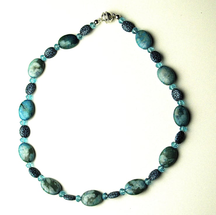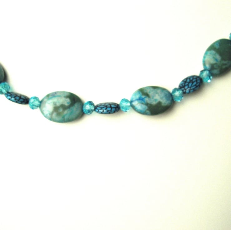 This stunning necklace is hand made from attractive oval turquoise agate beads interspersed with resin and crystal beads.