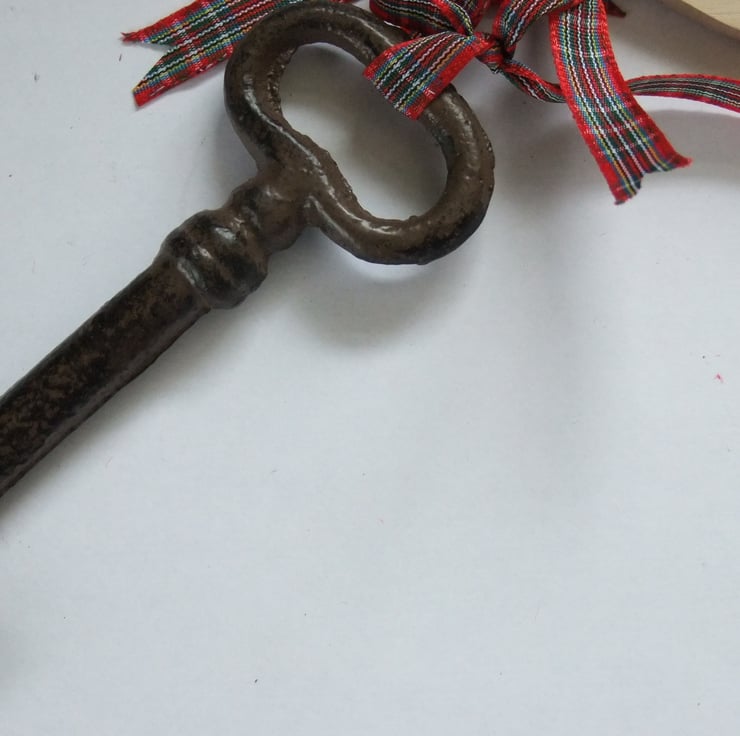 I have attached the key to the fob using a tartan coloured ribbon, but I can use blue or pink, for boy or girl if you would prefer.