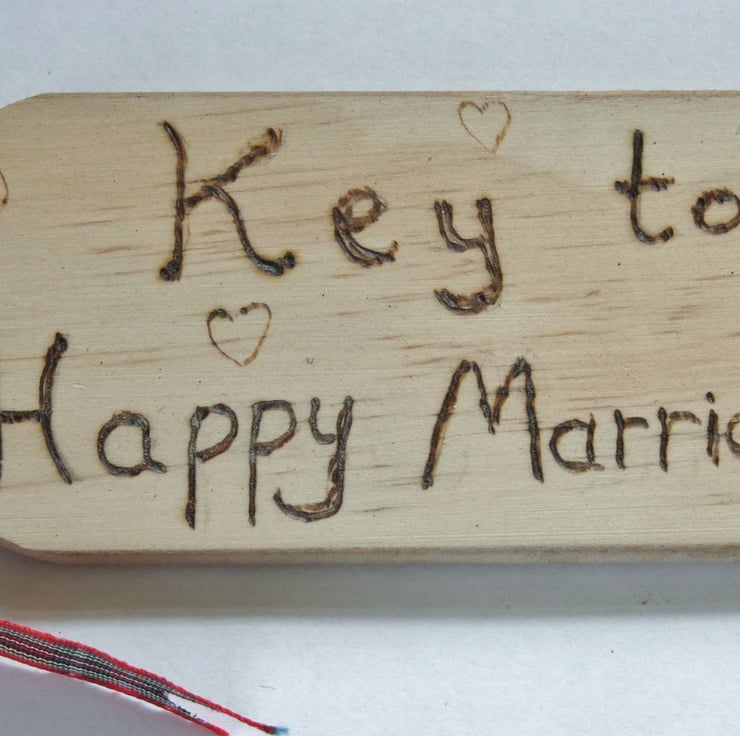 It has a heavy solid metal key attached to a wooden gift tag with the wording "Key to a Happy Marriage" The writing has been burnt on using a pyrography tool by hand, hence the crude, simple font.
