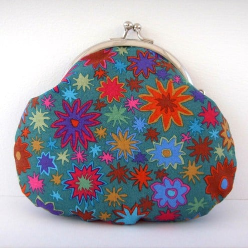 Perfect little purse for your keys, change and credit cards or mobile phone. Kaffe Fassett Starflower fabric with contrasting lining, padding and metal frame clasp.
