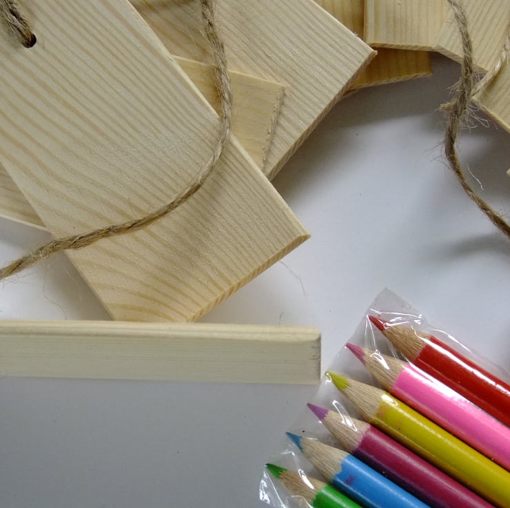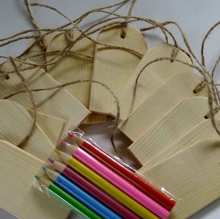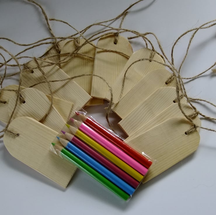 I have made several sets of wooden gift tags or labels, ideal for attaching to birthday or Christmas presents. This sale is for a set of 12 with a pack of coloured crayons