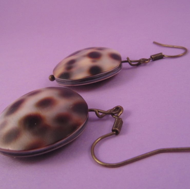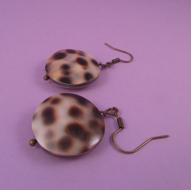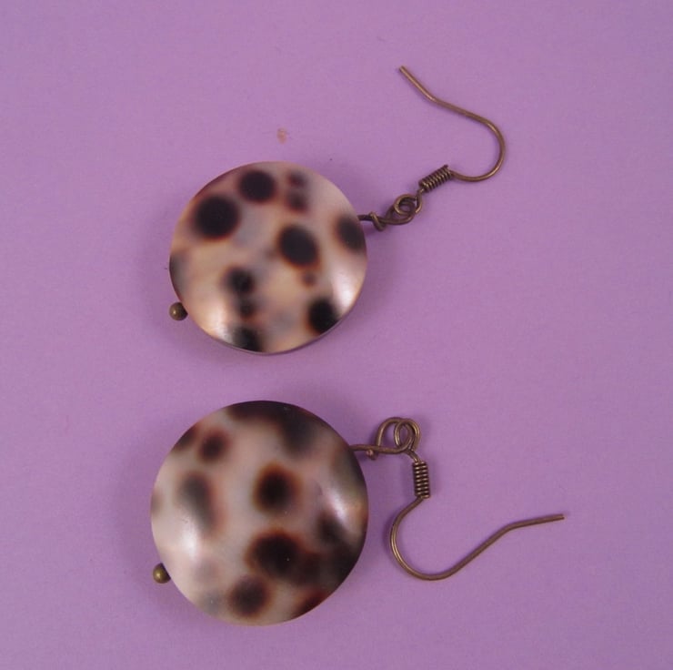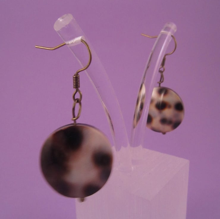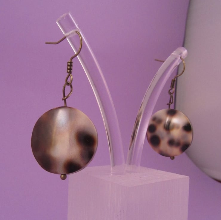 This is a beautiful pair of tortoise shell print shell dangle earrings. They are created using real shell and antique bronze e-coated copper. These are ideal for everyday wear.